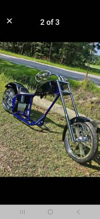 Pro 1 chopper never been on on street. Frame just painted candy blue tank and fenders black. 250 rear tire with matching wheels front and back. All brakes are new just need motor and transmission to ride