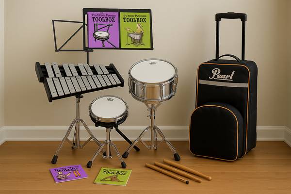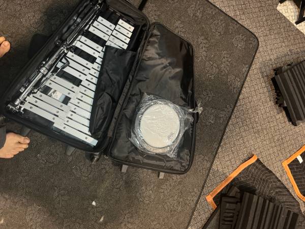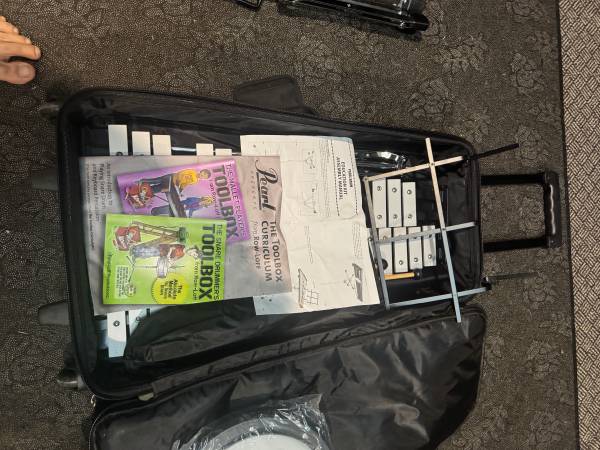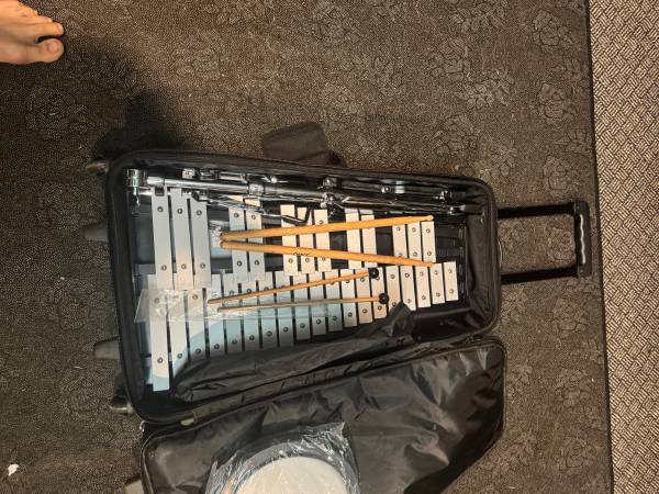 This is the same full-featured setup used in school band programs and percussion classes. This set includes a tunable snare drum, Remo practice pad, full 32-note bell/glockenspiel set, stands, drumsticks, bell mallets, books, and a rolling case. Everything is in excellent condition and ready to play.