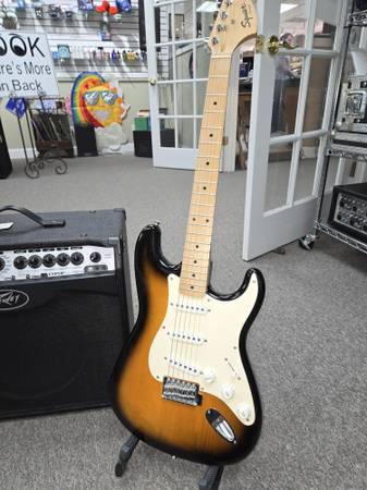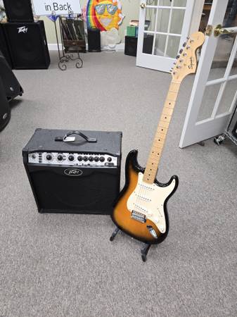 Fender Squier Strat 6 string electric guitar.Solid body, maple neck. Color is Sunburst. Peavey VYPYR VIP 2 solid state technology combo. 40 watts of power with 4 channels. These are priced to be sold together. A gig bag is included for the guitar.
