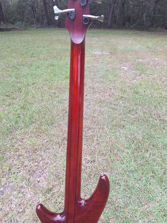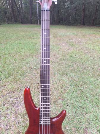 The SR905 is a five string Sound Gear series solid body electric bass model introduced by Ibanez for 2004. It was produced in South Korea in 2005. The SR905 features neck-through-body construction on figured maple wings with curved top attached to a maple and bubinga neck with a 24-fret rosewood fingerboard with abalone oval position markers and a matching headstock. Components include an Accu-Cast B25 fixed bridge with 16.5mm string spacing, and a pair of Bartolini MK1 active pickup's channeled through a Bartolini MK1 3-Band EQ, a plastic nut, Die-cast tuning machines and cosmo black hardware.