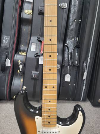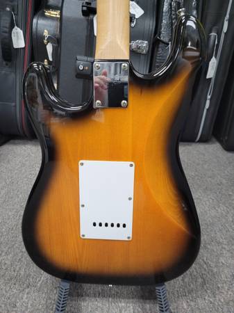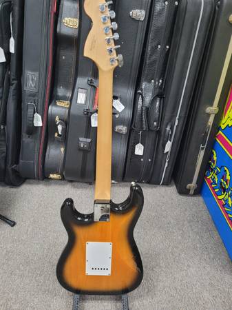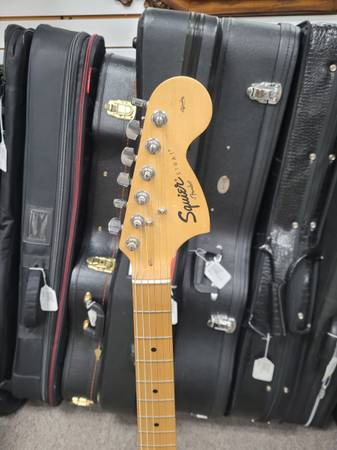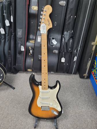 Fender Squire Strat 6 string electric, solid body, maple neck, color sunburst.