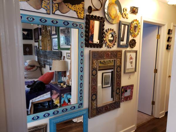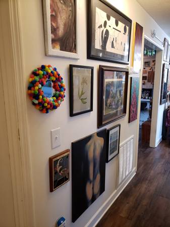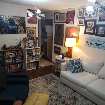 House looks like a regular brick ranch on the outside. Inside- lots of colorful, boho character, art on every wall. This house has a soul. Three roommates and two dogs live here, looking for the right fourth.