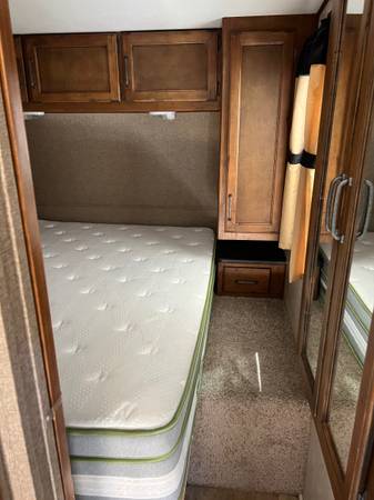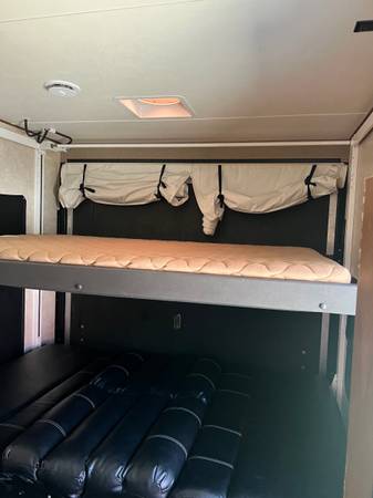 A sliding door in front takes you into the front master bedroom where you will enjoy a queen size bed with dual nightstands and overhead storage. The slide out wardrobe is split between the hall and bedroom when the bedroom sliding door is closed.