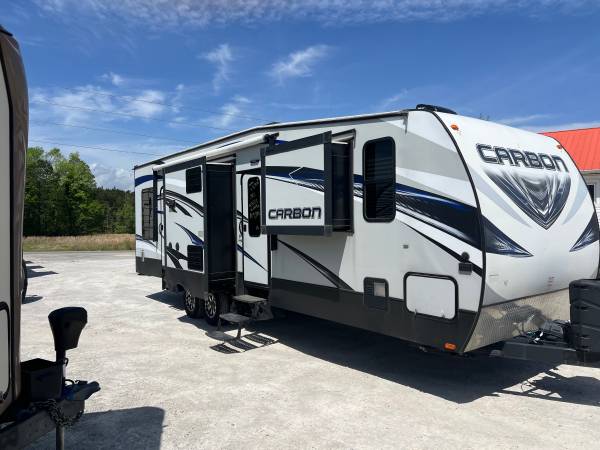 Head out for a great weekend adventure in this Carbon toy hauler travel trailer with family and friends! Model 33 provides a 10' garage space for the toys, and a living space with triple slides for added walking around room, plus all the amenities that make camping comfortable.