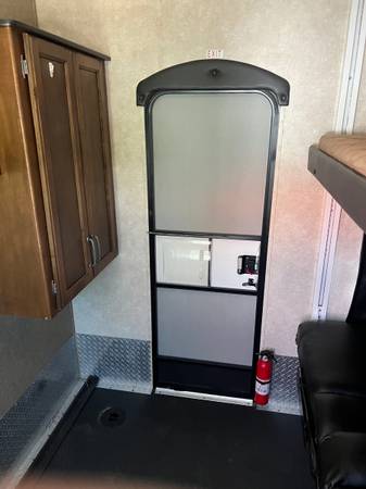 Back to the rear of the unit find a 10' garage space for your toys. You can enter from within the unit, using the side cargo man door, or rear ramp door if loading a few toys. Inside you will find an electric bed with dual opposing sofas below and a pantry for storage. This is perfect for when you have extra guests, or just need a bit more room to hang out after playing hard outdoors.