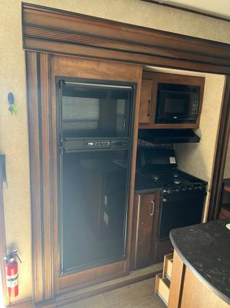 Enter the main side door and see a wide open combined living and kitchen area with a slide out refrigerator and three burner range to your left. There is overhead storage and a counter peninsula with a double sink and counter extension.