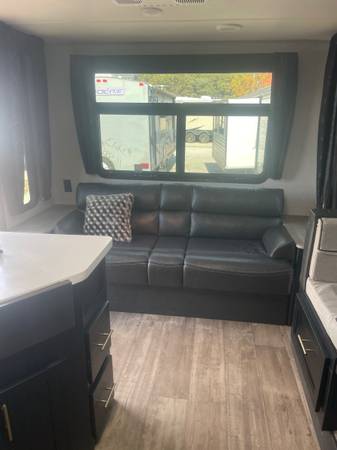 This Cherokee Grey Wolf Black Label travel trailer is perfect for your small family and will leave you planning your next outing before you are back from your current weekend away! You will find all of the comforts you need with plenty of livable space including a U-shaped dinette slide. There is also a sofa for more seating when company arrives, and there are end tables on either side to prevent spills. A spacious walk-through bath leads to a front private bedroom where you will enjoy a great night's rest on a comfortable RV king bed.