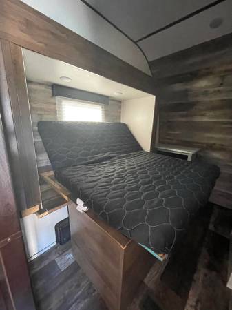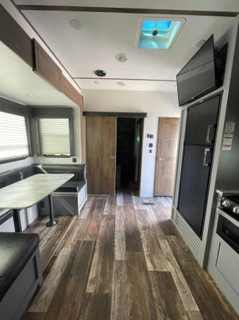 Imagine starting your next camping trip off right with this Vapor Lite travel trailer in tow. You will love that there is a unique layout for the private bedroom with a slide out adjustable bed, a dresser and a closet for plenty of storage for any weather. The full bathroom is conveniently located next to the main entry door so that you can quickly get inside to use the restroom and head back out for more fun. The kitchen offers everything you will need to feed the gang, and the U-shaped dinette slide offers a place to dine, play games, and relax. The garage provides seating and sleeping space, plus storage for your toys. Get ready for fun!