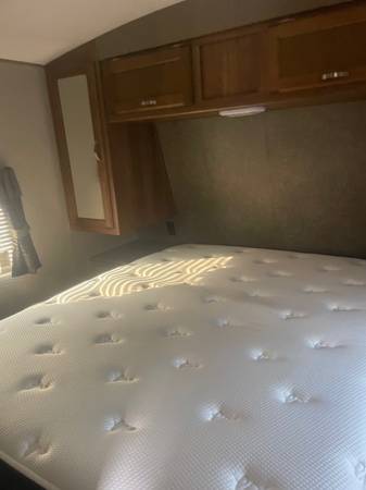 Back to the entry door head up the hall to the front private bedroom which features a queen size bed for a comfortable night's sleep. There are nightstands on both sides of the bed, plus closets and overheads storage too. You will also enjoy the amount of extra storage you will find beneath the bedroom in the outdoor pass-through compartment which is perfect for all of your outdoor camping gear, and so much more!