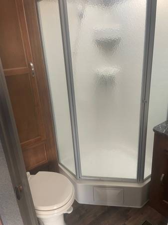 As you enter notice the convenient location of the bathroom directly across from the door. Inside the bath find an angled shower, toilet, sink, and linen cabinet.