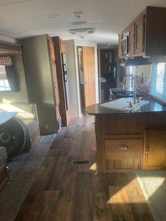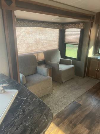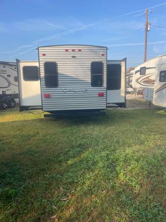 This Springdale travel trailer 311RE by Keystone RV features a rear entertainment layout, dual opposing slides for added space inside, a private front bedroom, and a fireplace with brick surround!