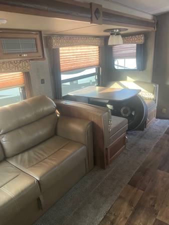 Moving further in toward the rear of the unit notice how the space opens up with dual opposing slides. There are two lounge chairs with an end table in the curb side slide. Opposite you will find more seating in a slide out that provides a tri-fold sofa with overhead storage, and a booth dinette. Along the back wall enjoy a complete entertainment center with storage surrounding a TV with a brick surround fireplace below.