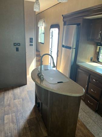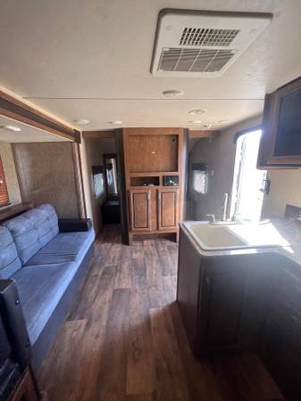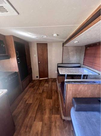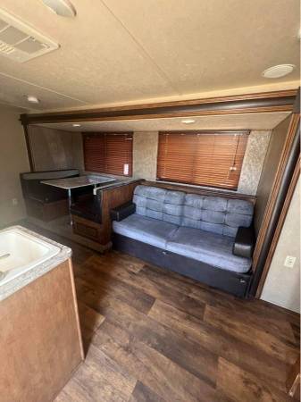 Straight in from the curb side door is a slide out sofa and booth dinette along the road side wall. This provides ample seating for meals and just hanging out, plus creates more walking around floor space too.