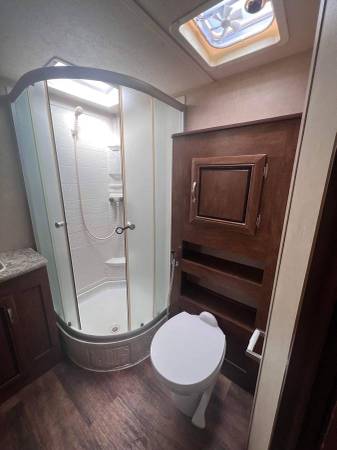 The very rear of this Salem Cruise Lite features a spacious full bath including a radius shower, toilet, and vanity with sink, plus overhead medicine cabinet. A full wall wardrobe offers plenty of clothing storage and more.