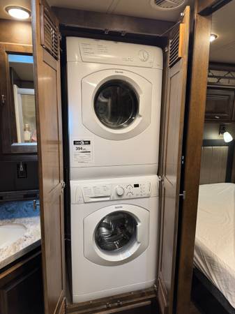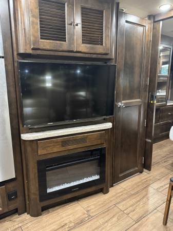 The interior is beautifully designed with high-end finishes and modern amenities, making it a truly luxurious living space. You will find a spacious living area which includes a recliner, couch with hide-away queen bed, fireplace, 3 Smart TVs, surround sound, dining area with seating up to four, a fully-equipped kitchen including a residential refrigerator, gas stovetop, and microwave with convection oven, bedroom with cozy queen-sized bed, plenty of storage, ceiling fan, private full bathroom includes a shower, toilet, sink, and washer and dryer and half bath conveniently located off the main living area.