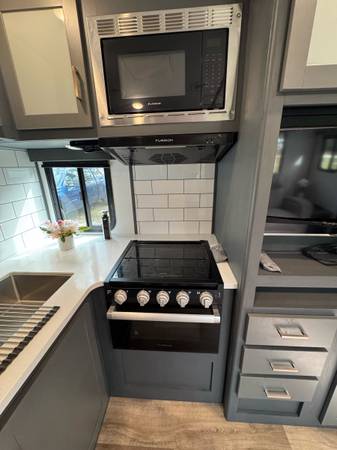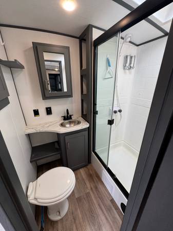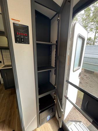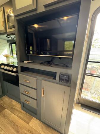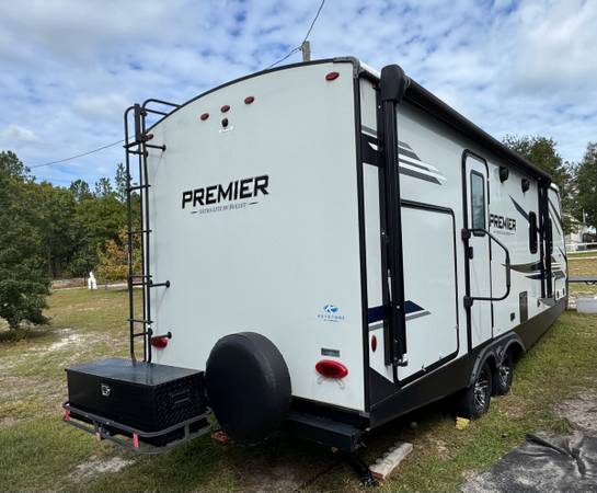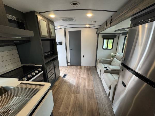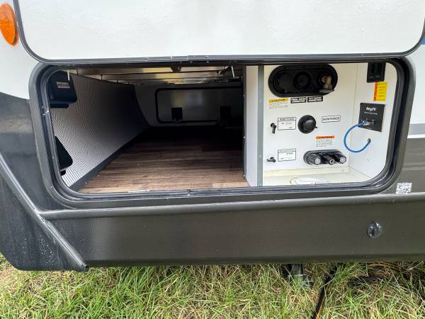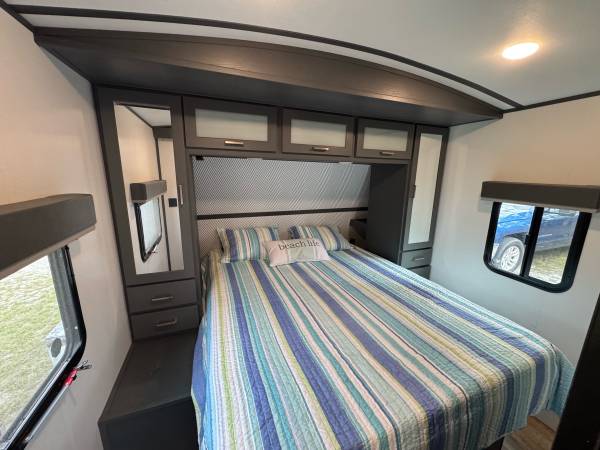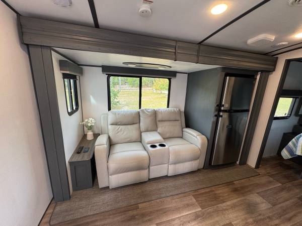 The 2022 Keystone Luxury Ultra Lite Bullet Premier 23RBPR is a top-of-the-line travel trailer that offers comfort for your road adventures. Insulated for colder weather. The modern kitchen features a large GE Refrigerator, large stainless sink, 4 burners propane stove, stainless oven, microwave and plenty of cabinet space. Two comfortable recliners to relax on, Samsung flat-screen TV with Bluetooth speakers in ceiling. The Furnace is ducted in the floor and the Air Conditioning is ducted in the ceiling. A private bedroom comes equipped with a Sleep Number Queen Bed (Left & Right Separate Firmness Adjustable Comfort) Topped with a Jell Pad Cover which has always been covered with a waterproof mattress protector. Two closets to hang your clothes and ample storage throughout. Even a Laundry Chute for your laundry needs. The bathroom includes a roomy shower with skylight, upgraded porcelain toilet, and stainless sink. Large closet and shelf area, medicine cabinet. A roof mounted Cell Phone Booster Antenna available with a Wineguard subscription. A concealed Fireproof Safe was added to store your valuables.