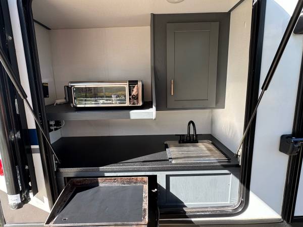 Outside, the Keystone Bullet Ultra-lite Premier has a power awning, outdoor kitchen with grill, pizza oven, stainless sink and LED lighting and outlet. A roof mounted solar panel, a large lockable outdoor storage areas and metal locker. Use the outdoor hot and cold faucet with the hose to wash your pets or just to fill things up or rinse things off.