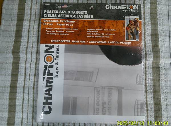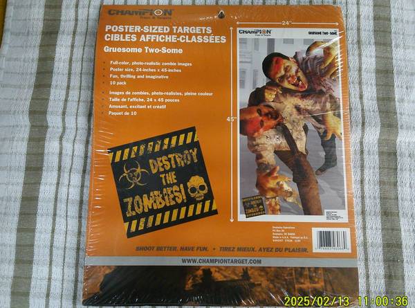 The "Zombie Target" is a multicolor Champion brand target designed for shooting practice. It features a Grusome Two-Some model specifically meant for target shooting activities. This target is ideal for hunting, range shooting, and other sporting activities. The design is likely to capture the attention of the shooter, making target practice more engaging and enjoyable.