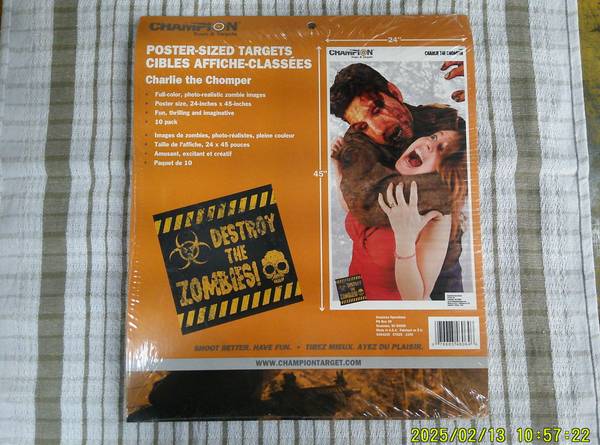 The "Zombie Target" is a multicolor Champion brand target designed for shooting practice. It features a Charlie the Chomper model specifically meant for target shooting activities. This target is ideal for hunting, range shooting, and other sporting activities. The design is likely to capture the attention of the shooter, making target practice more engaging and enjoyable.