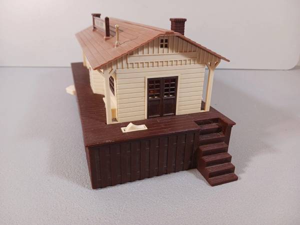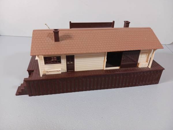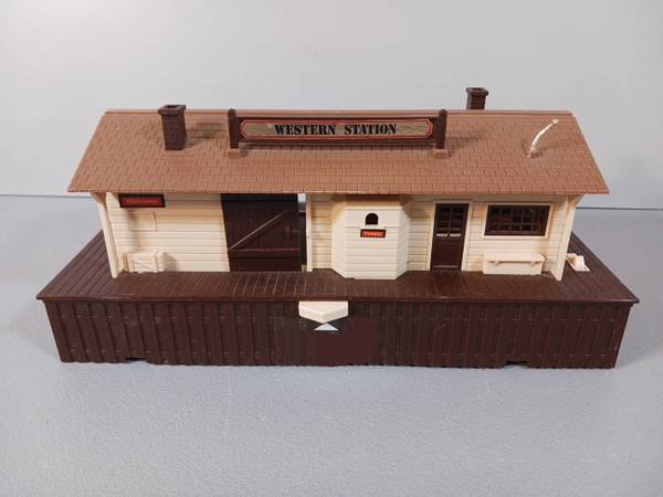 Vintage 1986 Bright Western Train Station sound does not work in the building, battery compartment needs to be fixed. Not exactly sure of the scale of building. Measures approximately 12" long x 5" wide X 5" High.