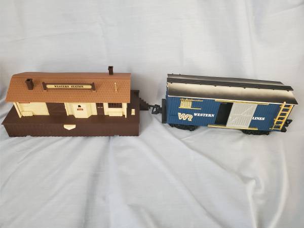 Up for sale a Vintage 1986 Bright Western Train Station and a 1986 Vintage Bright Silver Rail Express #1170 Train Blue Freight Car Cargo. Both come from a NON Smoking Pet Free home.