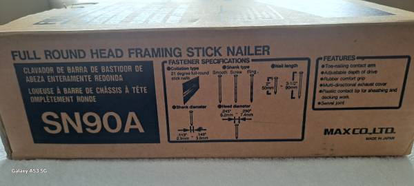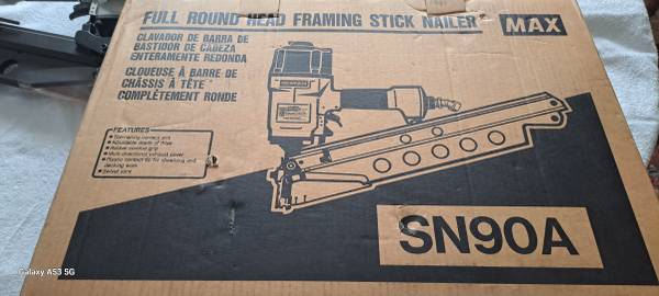 MAX SN90A, Full round head framing stick nailers, fires 21 degree 2 to 3 1/2 inch stick nails for framing or construction. Both nailers are NOS (new old stock) in original boxes and have instruction manuals. One of them has a swivel connector on it. Sale price of these nailers is **$150.00 each** (two available). If you buy both the price is **$275.00** for the two. I WILL NOT RESPOND TO "STILL AVAILABLE" OR SPAM OR SCAM EMAILS. Posting will be changed if quantity available changes and removed when both sell.