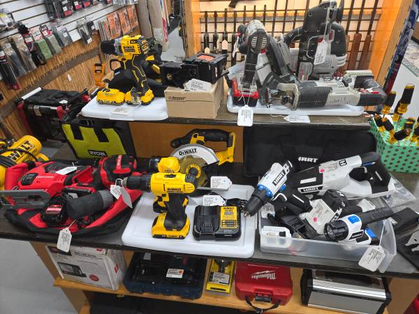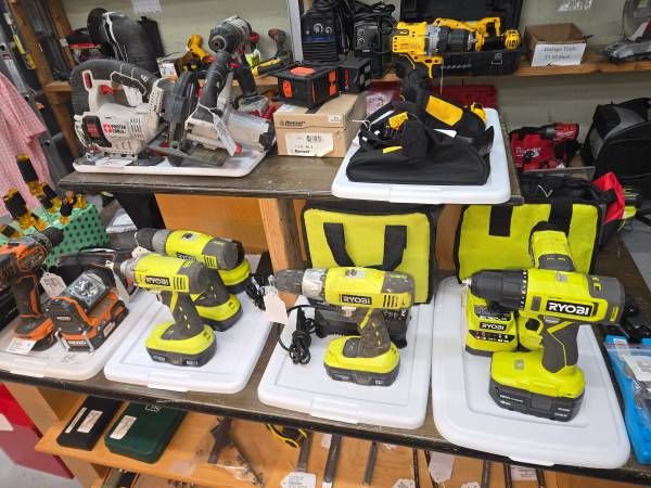 Assorted Cordless Power tools ranging in price price from $60 to $330. Name brands are: Craftsman, Dewalt, Hart, Milwaukee, Porter Cable, Ridgid and Ryobi.