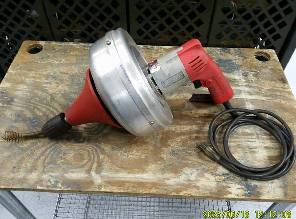 This is a Used Milwaukee 0566-1 Drain Opener. The box that comes with has some dents and scratches. Drain Opener has been used.