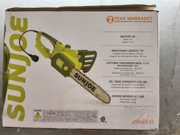 New never used or opened sunjoe 12" 9 amp electric chainsaw.